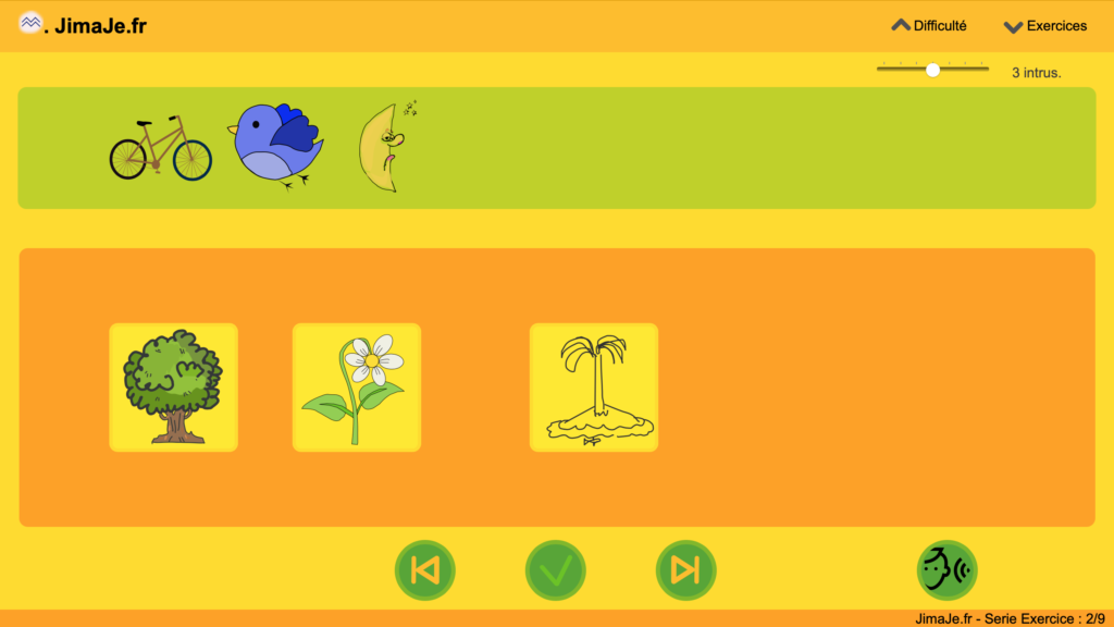 Enfin, le niveau de difficulté peut être adapté en modifiant le nombre de picto-phono-grammes dans la liste de la « pioche ». Vous pouvez ainsi vous limiter au strict nécessaire ou rajouter jusqu’à 6 intrus non utiles pour l’exercice. Par défaut deux intrus sont insérés.