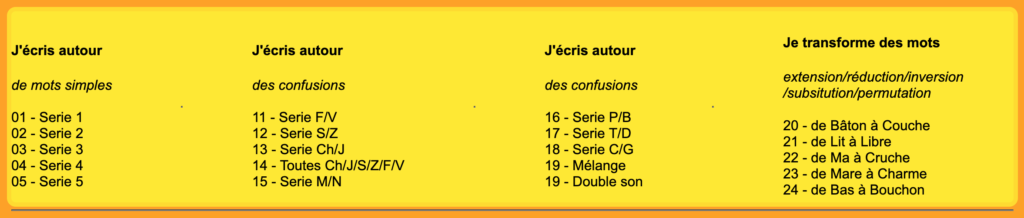 « Les exercices » permettent un travail guidé qui peut même être réalisé en autonomie. Vous réalisez tous les exercices de la méthode déjà enregistrés en série de mots : l’écriture de mots simples (01..05), le travail sur les confusions (11..19) ou encore des exercices pour développer la conscience et l’analyse phonétique (20..24).