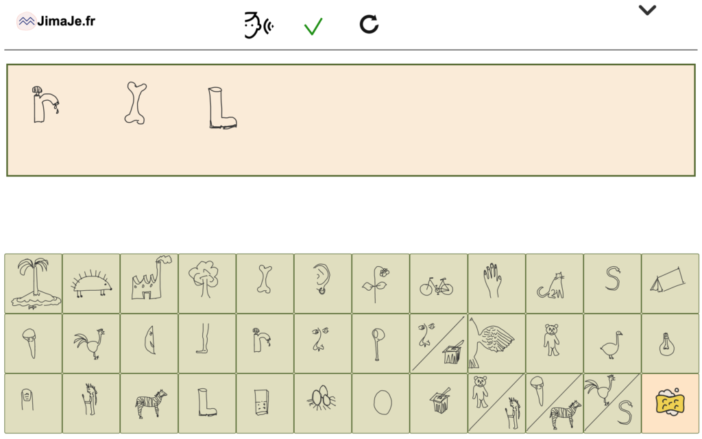 L’écriture se fait en cliquant sur les picto-phono-grammes ou en utilisant le glisser-déposer. Chaque mot est écouté puis une fois écrit, l’enfant peut demander une vérification. Dans ce cas la couleur de fond du pictogramme indique les éventuelles corrections à apporter.