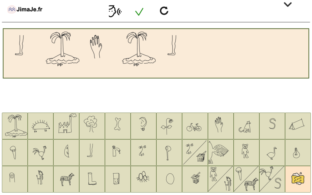 L’écriture se fait en cliquant sur les picto-phono-grammes ou en utilisant le glisser-déposer. Chaque mot est écouté puis une fois écrit, l’enfant peut demander une vérification. Dans ce cas la couleur de fond du pictogramme indique les éventuelles corrections à apporter.